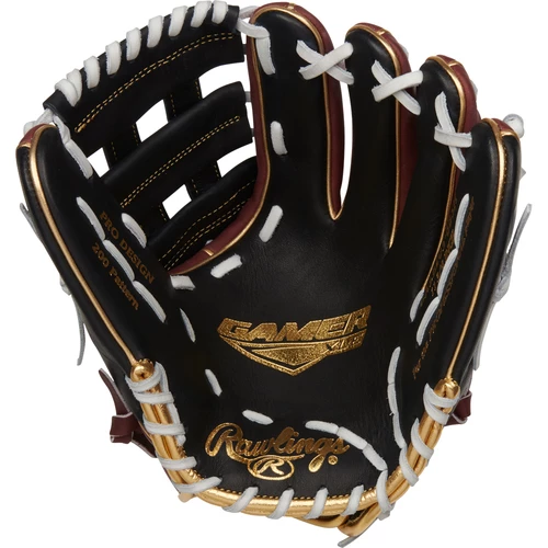 Maximize your defensive value with the all-new Rawlings Gamer XLE 11.75” Infield Baseball Glove. Rawlings Gamer line of gloves and mitts is one the companies most popular production lines, featuring pro-style patterns designed with high-quality products at economical prices. Constructed with soft, full-grain steerhide leather for unmatched durability while the 80% factory break-in process leaves the Gamers feeling game-ready. Designed with a Pro-H Web, this 11.75 infield pattern features a Dark Sherry and Black Colorway with Metallic Gold Welting and Binding for the perfect amount of shine as you grind. Also featuring a conventional back, Tennessee Tanning Pro Leather Lacing and a finger pad for added comfort and support.