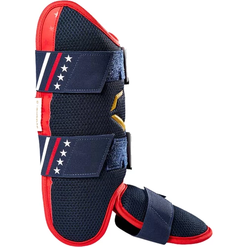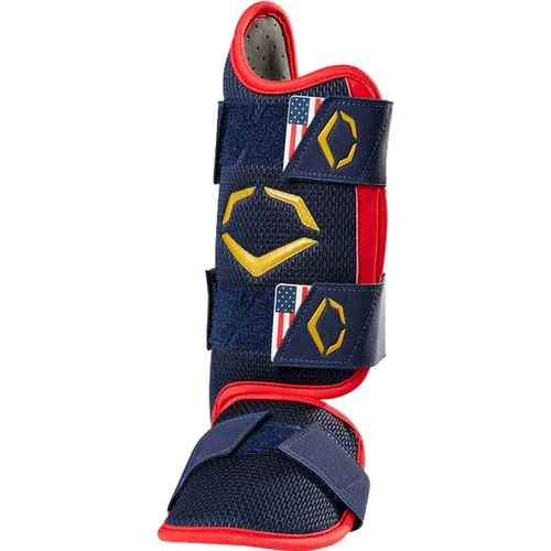 Keep your lower leg and foot protected from foul balls and HBP’s with the all-new special edition Evoshield USA PRO-SRZ Baseball/Softball Leg Guard. The USA Batter’s Leg Guard showcases a navy mesh material framed by red binding and a metallic gold EvoShield logo. An exclusive red, white, and blue strap put the finishing touch on this eye-catching guard. The USA Batter’s Leg Guard features EvoShield’s industry-leading lightweight Gel-to-Shell Technology; this air-activated material transforms the guard from a malleable gel into a customized, form-fitting shield in minutes. EvoShield’s dispersion technology spreads force across the surface of the guard, minimizing felt pressure on the point of impact. The guards’ ergonomic fit forms to your body shape, and a padded mesh interior manages moisture to improve comfort so you can focus on controlling every plate appearance. Make every at-bat a quality one in the all-new special edition Evoshield USA PRO-SRZ Baseball/Softball Leg Guard available at Bases Loaded: The Baseball and Softball Superstore.