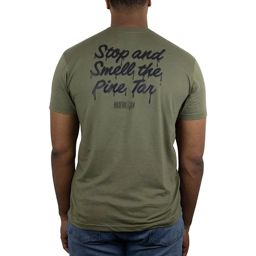 Let everyone know what a ballplayer’s favorite scent is wherever you go with the all-new Baseballism Men’s Pine Tar 3.0 Baseball T-Shirt. Featuring an awesome Military Green color, this extremely comfortable men’s baseball tee is constructed with 50% Cotton, 50% Polyester blend that’s long-lasting. The garment’s front features a screen-printed bat with pine tar and batting glove, while the back features “Stop and Smell the Pine Tar” written in pine tar. Also featuring a Vintage Baseballism bat screened on the back right of the garment. Form fit, order one size up for form fit. Care: Machine wash cold water – Tumble dry low heat. Let everyone know what your favorite smell is with the all-new Baseballism Men’s Pine Tar 3.0 Baseball T-Shirt available at Bases Loaded: The Baseball and Softball Superstore.