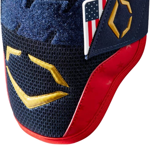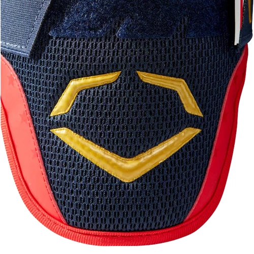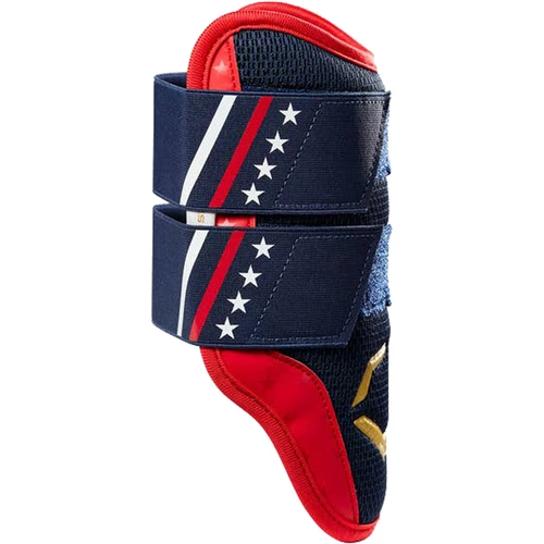 Show your patriotism when you dig into the box with the all-new special edition Evoshield USA PRO-SRZ Baseball/Softball Double Elbow Guard. The USA Batter’s Double Strap Elbow Guard showcases a navy mesh material framed by red binding and a metallic gold EvoShield logo. An exclusive red, white, and blue strap put the finishing touch on this eye-catching guard. The double strap design features an extended elbow guard that’s ideal for players with longer arms or those who want additional coverage up the triceps. EvoShield’s lightweight Gel-to-Shell Technology offers industry-leading protection; the air-activated material transforms the guard from a malleable gel into a customized, form-fitting shield in minutes. EvoShield’s dispersion technology spreads force across the surface of the guard, minimizing felt pressure on the point of impact. The guards’ ergonomic fit forms to your body shape, and a padded mesh interior manages moisture to improve comfort so you can focus on controlling every plate appearance. Hammer heaters in the all-new special edition Evoshield USA PRO-SRZ Baseball/Softball Double Elbow Guard available at Bases Loaded: The Baseball and Softball Superstore.