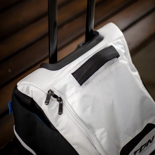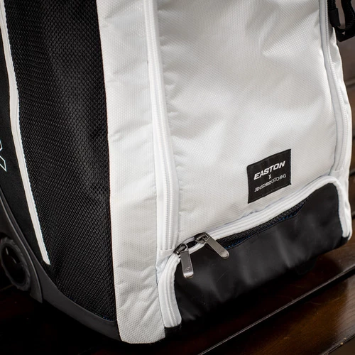The all-new Easton Jen Schro Softball Wheeled Catcher’s & Equipment Bag is stylish, functional, and practical. Designed in partnership with Jen Schro, the Easton Jen Schro Softball Wheeled bag features a large vented main compartment with two removable, heavy-duty shelves for organization or can be removed to create one large main compartment. The two mesh side pockets hold leg guards and an exterior loop buckle stash a glove or helmet, freeing up space inside the bag for other equipment and necessities. The telescopic handle and rugged inline wheels help transport your gear effortlessly across any terrain. Two-fully lined bat sleeves keep your bats safe while you travel and an internal mesh pocket with hook and loop for batting gloves. Also featuring a small removable bag and a felt-lined pocket for personal items. Dimensions: 28.5″ H x 16″ W x 12″ D. Easily tow all of your gear with the all-new Easton Jen Schro Softball Wheeled Catcher’s & Equipment Bag from Bases Loaded: The Baseball and Softball Superstore.